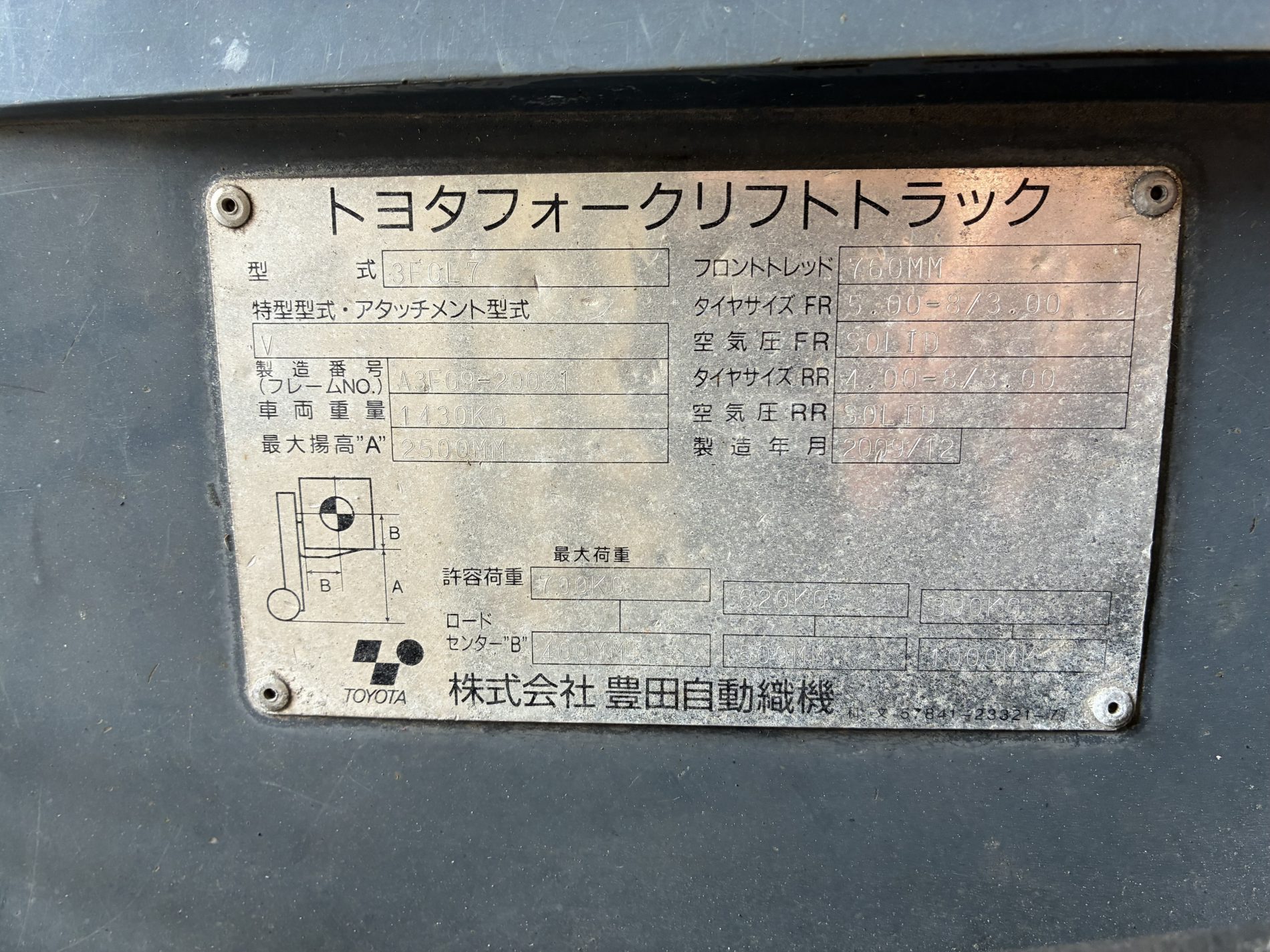 現状車輌001 トヨタ 3FGL7販売中整備済塗装予定車 ガソリン/0.7t/− 販売価格(税別) 600,000円 660,000 円(税込) お電話でのお問い合わせ 078-585-5439 営業時間8:00~17:00/定休日土・日・祝 お問い合わせ LINEでお問い合わせ 検討リストに追加リストから削除 在庫ID001整備塗装状態整備済塗装予定車メーカートヨタ型式3FGL7年式2009年燃料タイプガソリン最大荷重700kg マスト種類2段マストマスト揚高2.5mツメ長920mmミッションMT稼働時間0hアタッチメント−